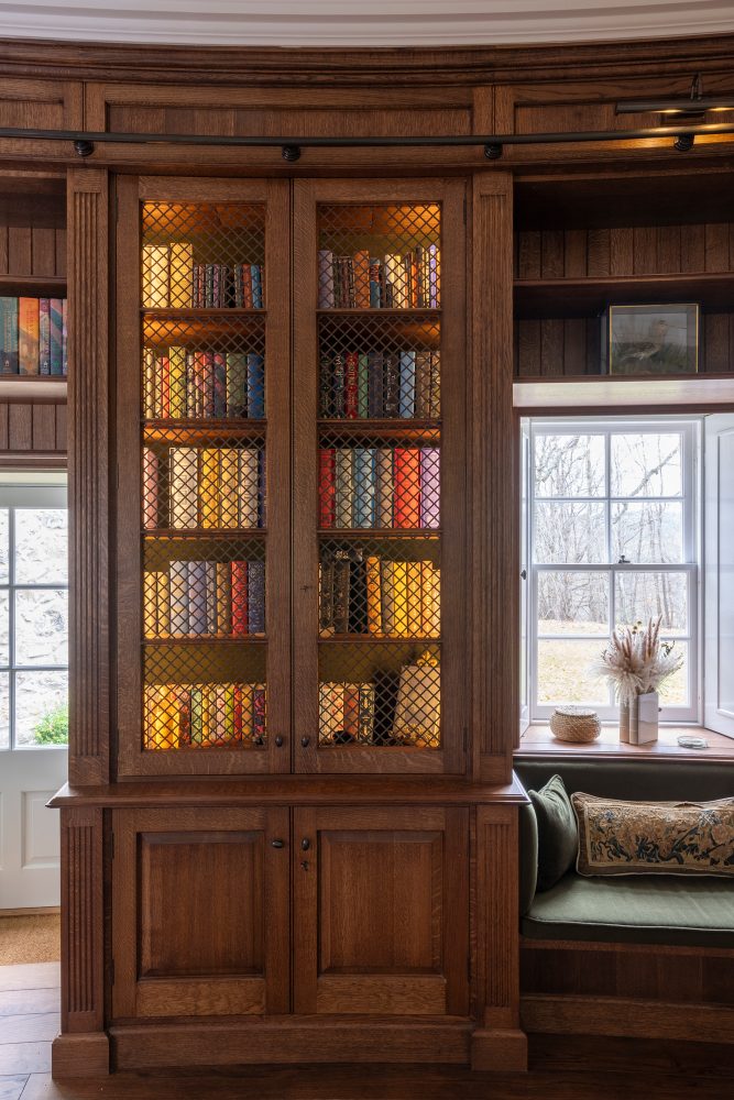 Against the backdrop of the dark oak, delicate details were added to soften the space. Dark green merino velvet seating nooks were added at each window, bronze oval handles on each door, and a bronze open diamond mesh forms the front of the upper doors, allowing the bookcases to be locked closed whilst still showcasing all the books inside. A playful wallpaper was chosen for the surrounding walls to bring the fantasy worlds of the books off the page.