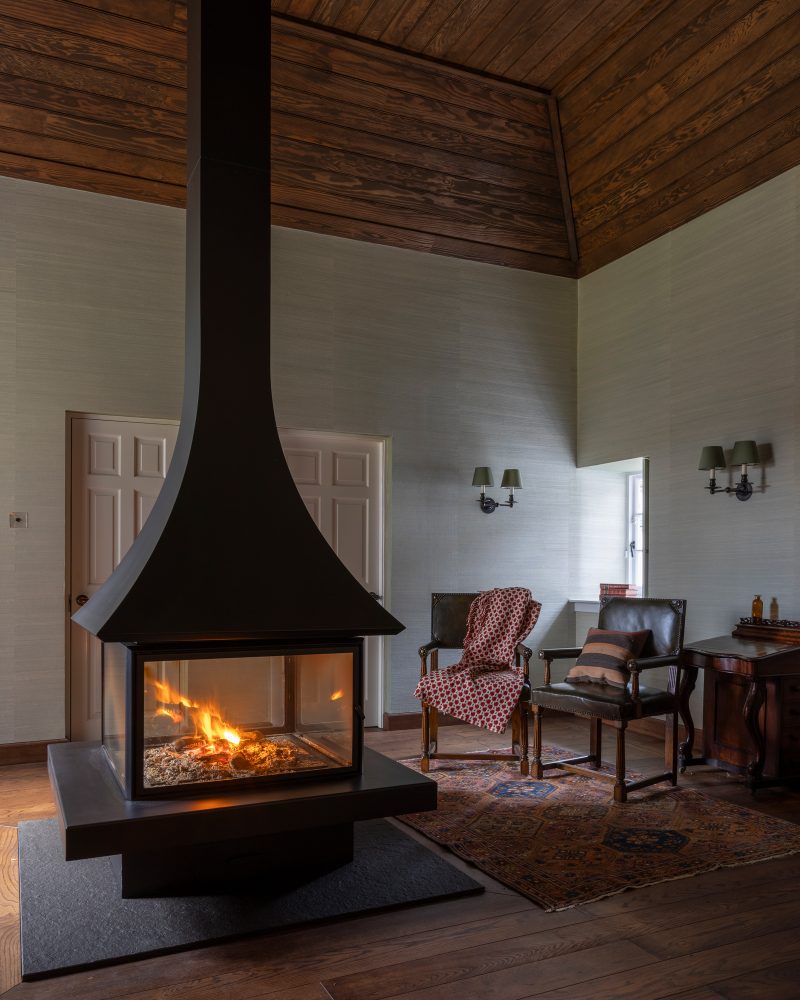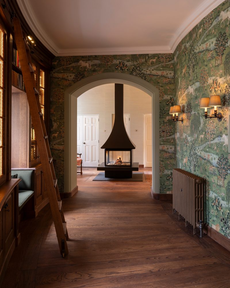 At the end of the corridor, an archway was formed, framing a new fireplace in the reading room. The stove sits in the centre of the room with its distinctive flue disappearing above. The shape of the flue is reminiscent of the iconic whisky distilleries spread across the surrounding Speyside area.