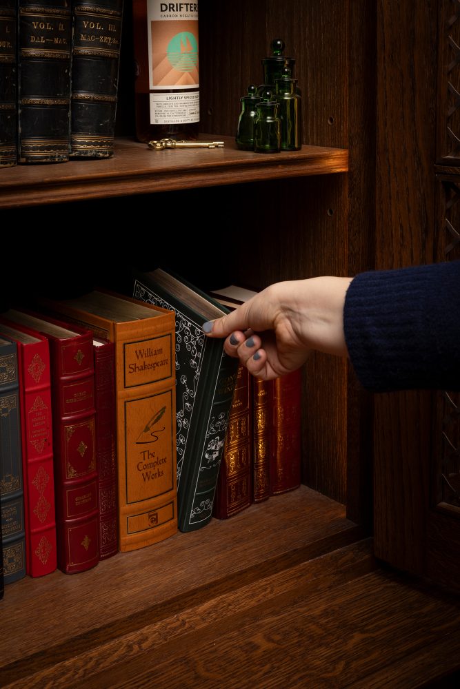When searching for something to read, you may inadvertently knock a novel that unlocks a hidden door.