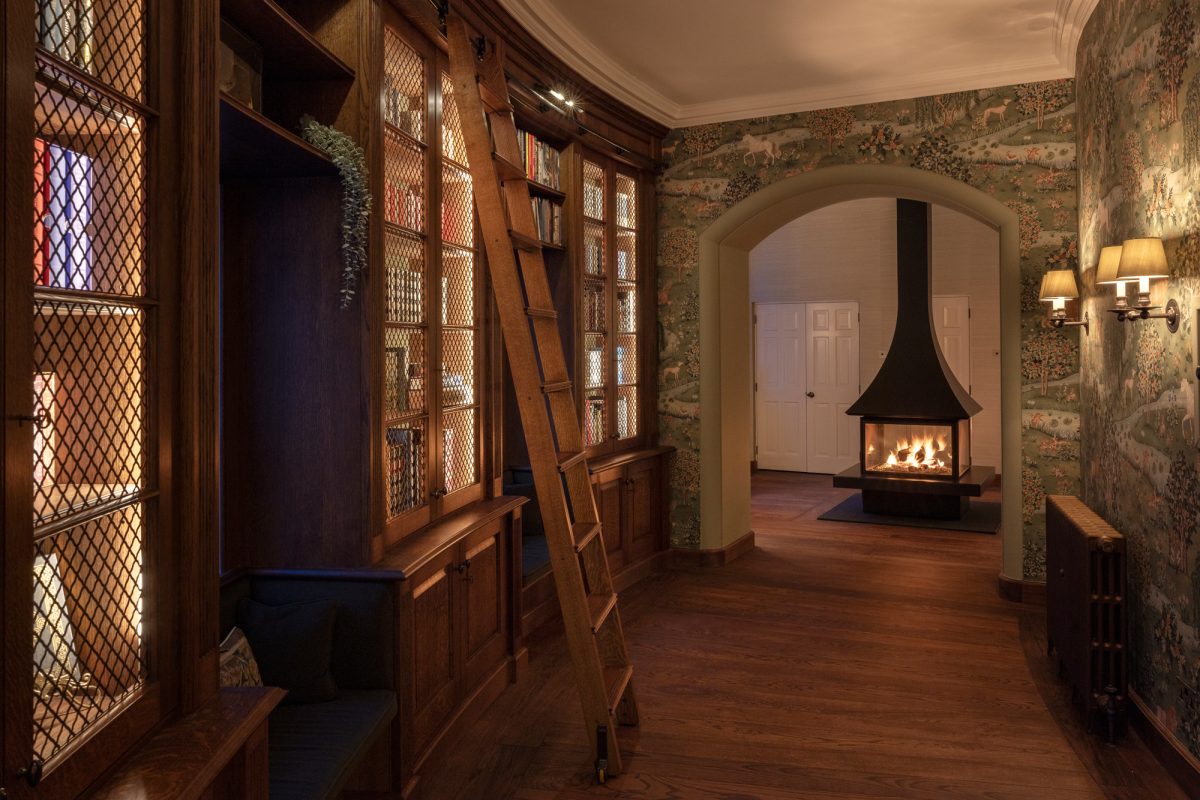 The library sits within the western extension, which curves around the courtyard. This was formerly a hunting corridor leading to the gun safe. No longer necessary for the new homeowners, GLM designed a solution to transform the disused corridor into a key feature for the house – a Library, with reading room and hidden wine cellar.